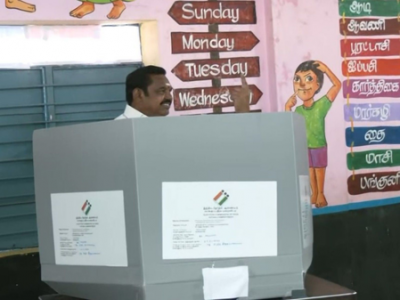 AIADMK General Secretary Edappadi K. Palaniswami cast his vote along with his family at a polling booth in Siluvampalayam Panchayat Union Primary School in Salem.