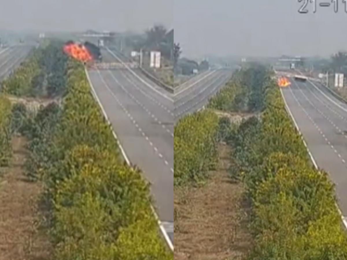 Tragic accident occurred on Delhi-Mumbai Expressway in Rajasthan's Dausa, in which container truck driver died after vehicle collided with an overhead LED display board. Following the accident the board busted in flames. Disturbing video of this incident went viral on social media, in which the accident has been captured on CCTV. The crash resulted in an immediate, explosive fire, trapping the driver inside. The cause of the crash and whether other vehicles were involved are currently unknown.