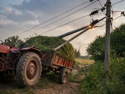 Long iron pipes, approximately 10 feet in length, fixed on the trolley to carry more fodder, struck sagging overhead high-tension wires.