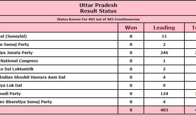 See the latest trends by EC in UP, BJP is marking solid lead, out of 403 seats BJP is leading in 246 seats.