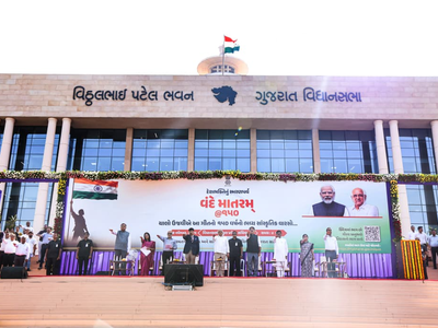 Gujarat Chief Minister Bhupendra Patel led the state-wide celebrations to mark the 150th anniversary, while several programs were organised across the state, where people not just sang the national song but also took an oath to adopt indigenous goods.