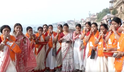 At the iconic Ganga ghats in Kashi, groups of women -- many from the Bengali community -- gathered to celebrate his arrival with traditional rituals. They performed 'shankhnaad' (conch-blowing), offered prayers to Maa Ganga, and planned a grand welcome with flowers and an aarti.