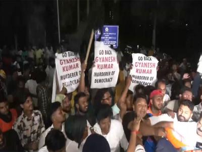 New Town (West Bengal) [India], March 8 : The West Bengal locals on Sunday gathered infront of a private hotel in New Town, wearing posters on their chest that read 'Go back, Gyanesh Kumar, murderer of democracy' as the Chief Election Commissioner (CEC) Gyanesh Kumar along with Election Commissioners SS Sandhu, Vivek Joshi and Senior Deputy Election Commissioenrs Maneesh gard and Pawan Kumar arrived at the Kolkata Airport along with CEC Gyanesh Kumar.