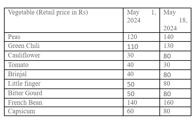 Brinjal, which was available at Rs 50, is now being sold at Rs 80 per kg in retail. Similarly, the price of cauliflower has increased from Rs 30 to Rs 80 per kg.