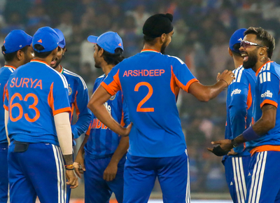 On a black-soil pitch, Tilak Varma and Hardik Pandya added 105 runs for the fourth wicket, with the former making 73 off 45 balls and the latter hammering 63 off 38 deliveries, including getting his fifty in just 16 balls, the second fastest half-century hit by an India men’s batter in T20Is.