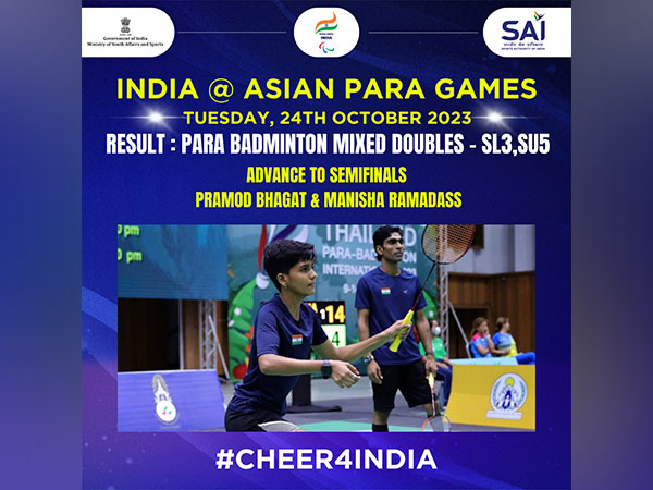 Hangzhou [China], October 24 : Indian shuttlers Pramod Bhagat and Manisha Ramadass stormed into the mixed doubles SL3-SU5 semi-finals on Tuesday in the ongoing 4th Asian Para Games.