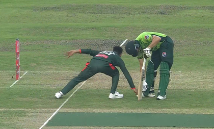 As the ball made contact with his pads, Agha bent down and picked it up before handing it back. Miraz quickly collected the ball and broke the stumps with Agha still outside the crease, appealing for a run-out.