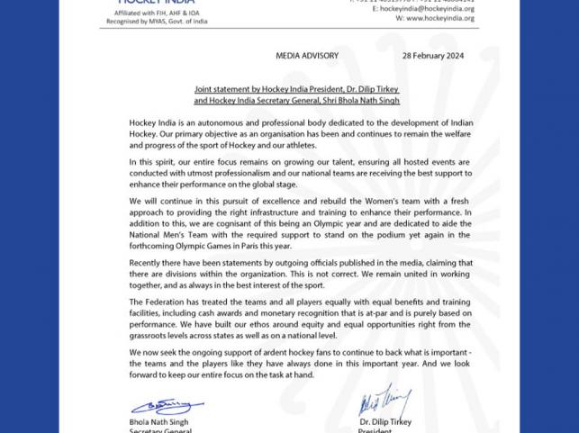 Hockey India President Dilip Tirkey and Secretary General Bhola Nath Singh refuted claims of a division within the organization made by outgoing CEO Elena Norman. In response to Norman's assertions of factionalism and a challenging work environment, Tirkey and Singh issued a joint statement asserting their unity and commitment to the sport's best interests.