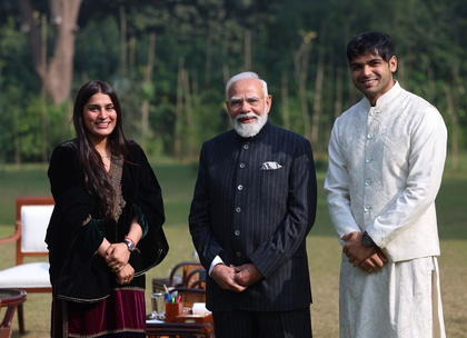 New Delhi, Dec 23 Prime Minister Narendra Modi hosted the two-time Olympic medallist Neeraj Chopra and his wife, Himani Mor, here at his residence, 7, Lok Kalyan Marg, on Tuesday.
