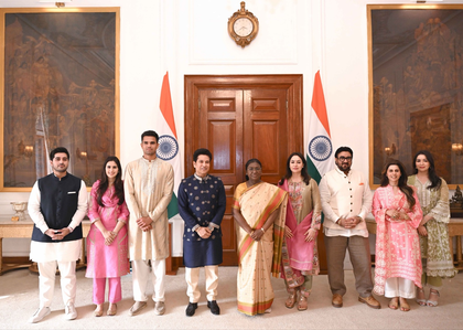 New Delhi, Feb 10 Former Indian cricketer Sachin Tendulkar, along with his family and the family of his son's fiancee, Saaniya Chandhok, visited Rashtrapati Bhavan on Tuesday to meet President Droupadi Murmu and formally invite her to Arjun Tendulkar's wedding, scheduled to take place in early March.