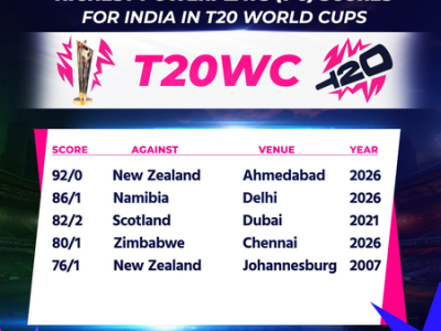 India raced to 92 for no loss in six overs, rewriting the record books in the summit clash of the T20 World Cup. The previous best powerplay total in the tournament was 92/1 by the West Indies against Afghanistan in 2024, while India’s previous best in the tournament’s history came in the same edition, when they scored 86/1 against Namibia.