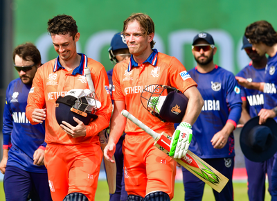 Brief Scores: Namibia 156/8 in 20 overs (Jan Nicol Loftie-Eaton 42, Jan Frylinck 30; Logan van Beek 2-13, Bas de Leede 2-20) lost to Netherlands 159/3 in 18 overs (Bas de Leede 72 not out, Colin Ackermann 32; Bernard Scholtz 1-27, Ruben Trumpelmann 1-30) by seven wickets