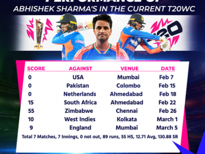 Abhishek's numbers in the tournament make for uncomfortable reading. In seven matches, the left-hander has managed scores of 0, 0, 0, 15, 55, 10 and 9, a total of just 89 runs at an average of 12.71.