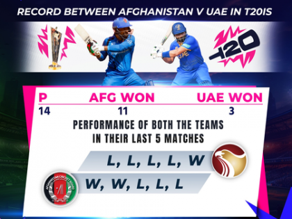 The two teams have met 14 times in T20Is, with Afghanistan winning 11 games and the UAE emerging victorious in three matches. They have never previously met in an ICC T20 World Cup, making Monday's encounter their first meeting in the tournament's history. In their last five encounters, Afghanistan have a 4-1 edge over the UAE, something which should soothe the Rashid Khan-led side.