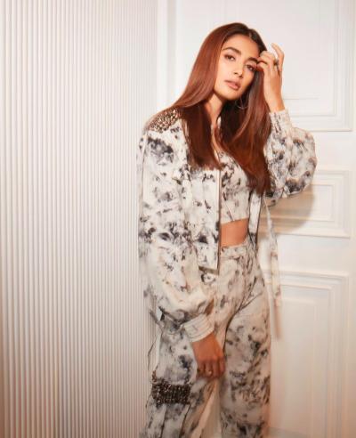 Pooja Hegde looks edgy in a printed black and white co-ord set, which she paired with a matching crop jacket. She levelled up the outfit's appeal by sporting black boots, and opted for a nude makeup look.