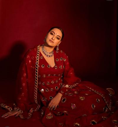 Sonakshi Sinha dazzled in a traditional red suit adorned with intricate mirror work, adding a festive sparkle to her ensemble. The deep red shade was a bold choice, complementing her confident personality. With subtle makeup and statement earrings Sonakshi finished her look with a sindoor. Sonakshi’s look was festive yet edgy.