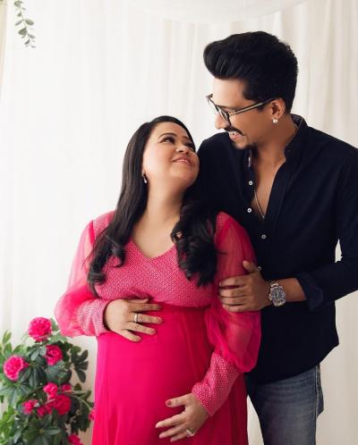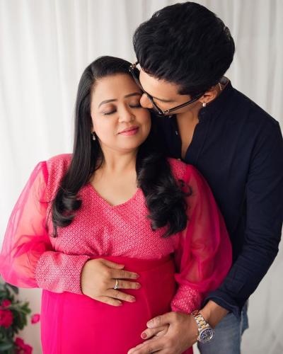 Haarsh, who wore a black shirt and denim jeans, posed for the pictures with his hand placed on Bharti's hand over the baby bump.