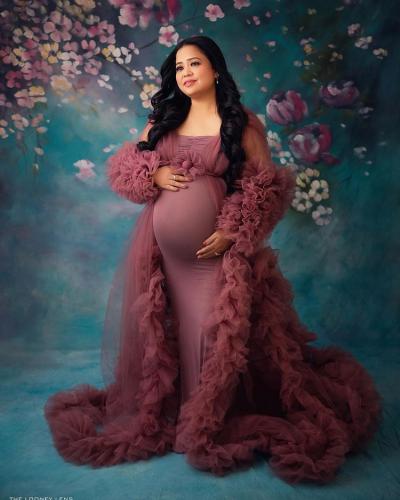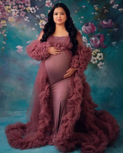 The pictures showed the comedian posing in a pink gown. Bharti, who was seen cradling her baby bump in the snaps, wore subtle makeup and left her hair loose. The artsy background of the picture featured a flower painting.