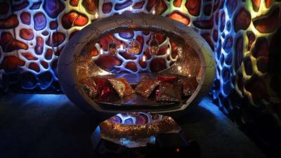 The confession room - The entrance to the confession room will transport the contestants out of space. A diamond shape zone with two horse faces on the top amplifies the entire zone that will lead the way to the most important room area of the house- the confession room. One of the most dramatic spaces of the house has been crafted keeping in mind the nature of its existence and the volatility of emotions. A dominating cracked egg-shaped seating is colorful and mysterious with overflowing sparkly upholstery.
