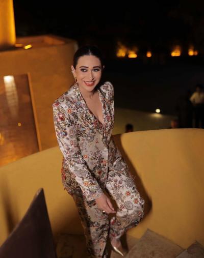 Make a statement with a multicolor blazer and matching pants, just like Karisma. This chic, modern look is ideal if you want to break away from traditional attire while still keeping it festive.