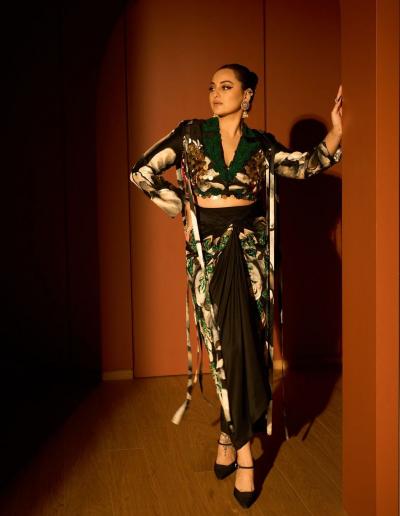 Go bold with a black and green skirt and top combo like Sonakshi’s. This edgy look adds a modern twist to Diwali style and is perfect if you want to stand out with a striking, festive appearance.