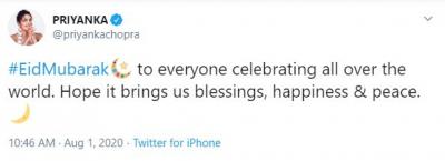 Priyanka shared a message on her Instagram story, “#EidMubarak to everyone celebrating all over the world. Hope it brings us blessings, happiness & peace.”