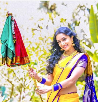 Shraddha Kapoor’s Gudi Padwa look featured a striking yellow and purple Nauvari saree, accessorized with gold jewelry and purple bangles, reflecting festive vibrancy and cultural richness.