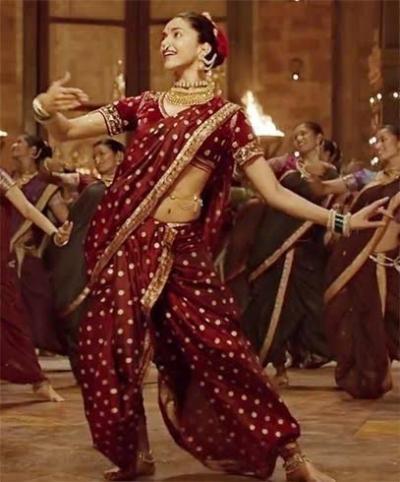 In the song “Pinga” from Bajirao Mastani, Deepika Padukone mesmerized audiences wearing a maroon Nauvari saree enriched with intricate gold detailing.