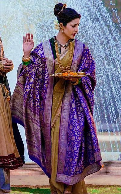 Priyanka Chopra’s portrayal in Bajirao Mastani showcased her in a golden Nauvari saree paired with a green blouse and a contrasting purple shawl, complemented by exquisite gold jewelry.