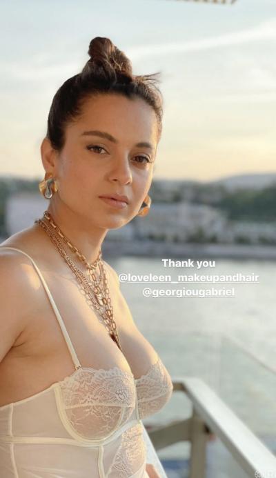 Kangana chose to wear a white corset bralette teamed with matching pants. She accessorised her look with golden neckpieces and earrings. The actress tied her hair into a high bun.