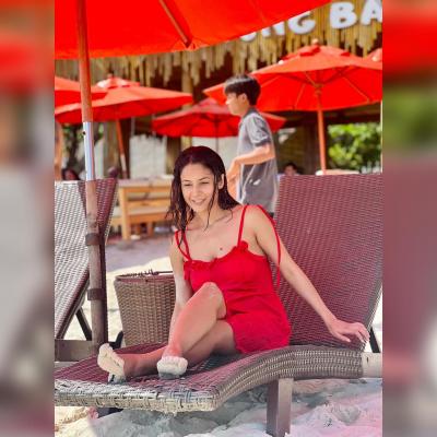 The former Bigg Boss contestant took to Instagram to share a few pictures of herself in a short red dress as she posed on the beach under the morning sun, with the blue sea in the backdrop