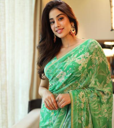 Janhvi is wearing heavy earrings with a green-colored sari and has kept her hair open.