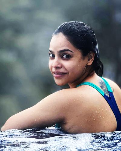 Sumona Chakravarti can be seen wearing a blue-coloured swimsuit and enjoying herself.