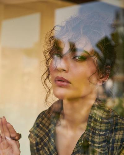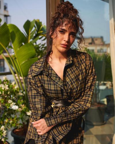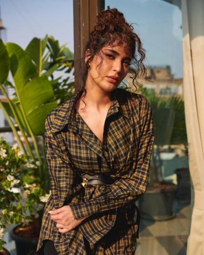 The pictures shared by Karishma Tanna show her dressed in a brown checker shirt and sporting curly hair styled into a bun.