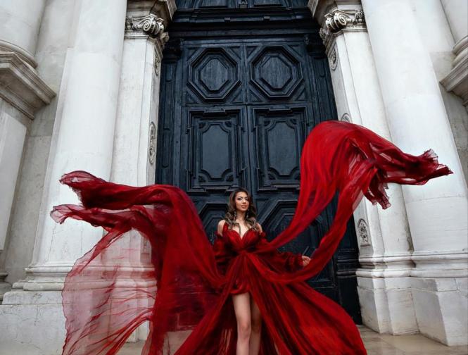 Her rose-pink satin look under the Tuscan sun captures her softer, romantic side. The one-shoulder drape and shimmering silver embroidery highlight her effortless elegance, radiating an old-world charm wrapped in modern confidence.