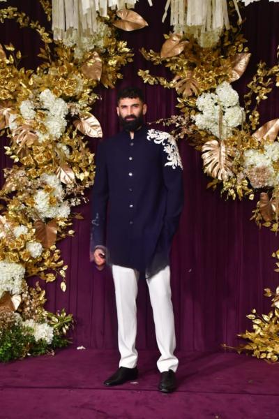 Aditya wore a navy blue bandhgala with embroidery on the shoulder. He paired it with white pajamas and black mules, giving his outfit a royal yet relaxed look.