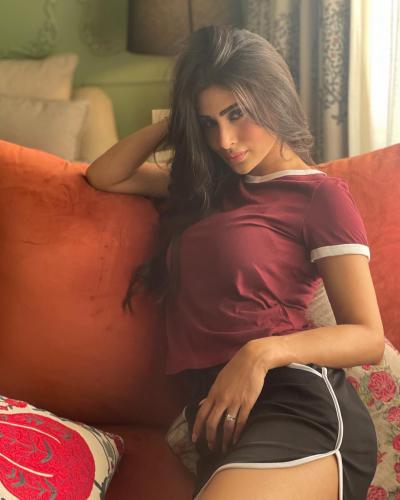 The actress looked effortlessly amazing in a casual outfit. The Naagin actress sported a casual maroon T-shirt and paired it with a black short skirt. She styled her hair open and can be seen relaxing on the couch