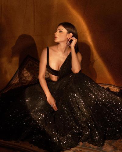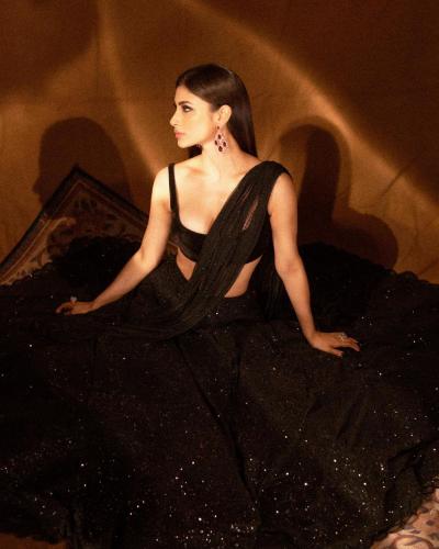 In the latest photoshoot, Mouni is wearing a black shimmery lehenga choli.