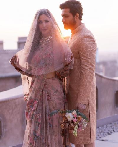 The pictures are going so viral on social media. Katrina is looking so pretty in her peach coloured saree, to match the diva's beauty Vicky has also opted peach coloured sherwani.
