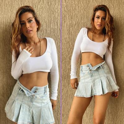 In these pictures, Nia Sharma is seen wreaking havoc in a white full-sleeve crop top and denim short skirt.