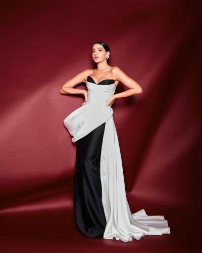 In these pictures, Nora Fatehi is looking very beautiful in black and white color silk off shoulder gown.