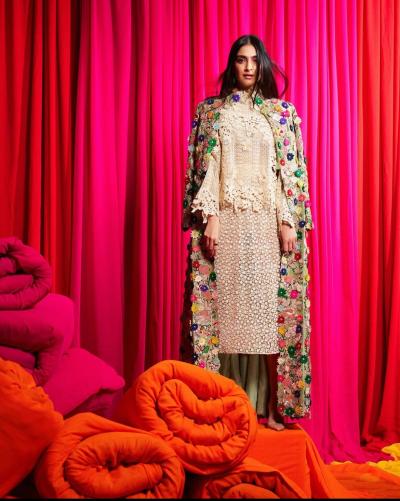 Sonam Kapoor, with her style statements, has solidified herself as a global fashion icon. The actress donned a beige boxy outfit, featuring beige embroidery all over. She layered her ensemble with a floral cape, adding drama to the off-beat fashion pick.