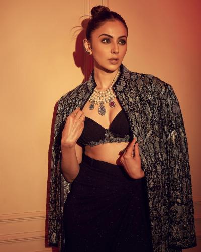 To complement her appearance, Rakul has opted for minimal makeup and styled her hair in an elegant fashion.