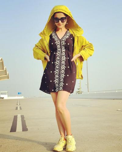 Rubina Dilaik recently posted a pictures of herself in a denim look. She complemented her look with black footwear. As for accessories, the actress wore some neckpieces. She styled her hair in loose curls. Rubina Dilaik captioned her photos, "Hello July.