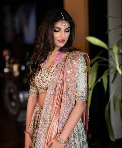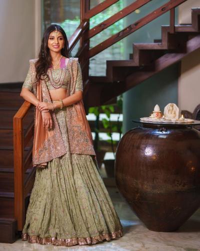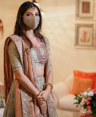 In one of her photos, Mihika Bajaj also appeared wearing a matching mask with her lehenga.