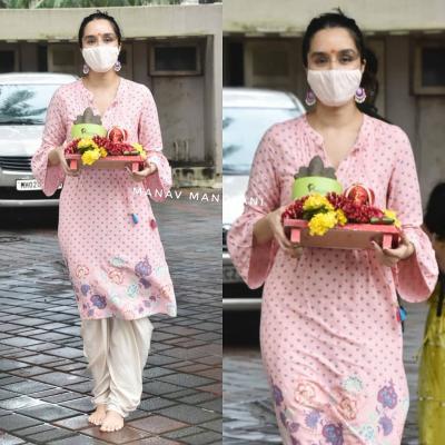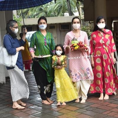 Shraddha Kapoor, along with her family, also took part in Ganpati visarjan at her home. She was seen in a pink and white kurta salwar and wore a mask for safety. The Ganesha idols were immersed in a bucket at home.