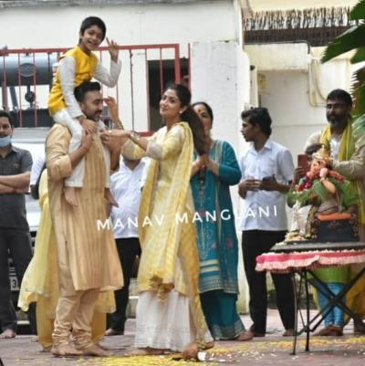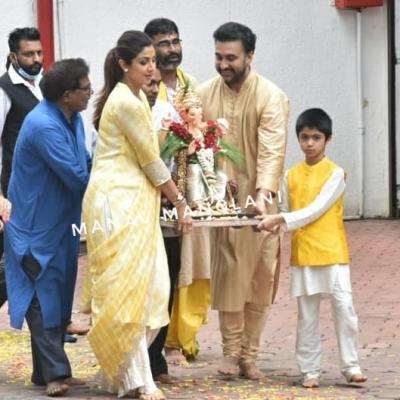 Shilpa Shetty and family took part in the Ganesh Visarjan celebration on Sunday. They immersed the idol of Lord Ganesha in a water-filled tub at home itself. The family had welcomed Lord Ganesha on Saturday.