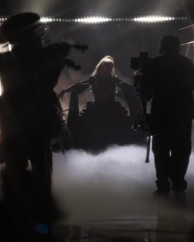 In this photo, Christina is wearing black leather arm warmers and Prada gloves.