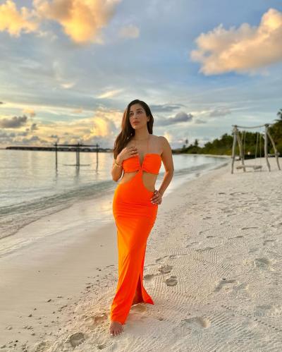 The Bollywood beauty could be seen donning a chic orange beach dress coupled with a simple gold bracelet and a ring, exuding elegance and grace in every frame.