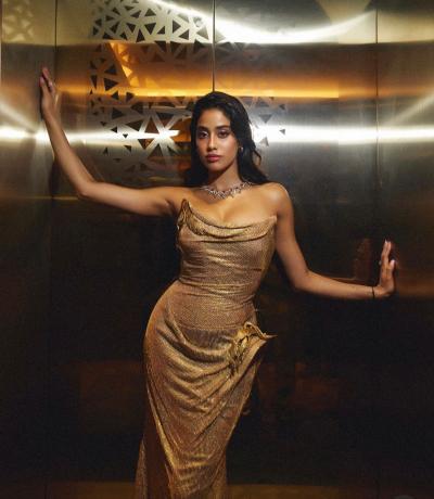Janhvi is a vision in a golden gown that radiates warmth and festivity. The luxurious color and flowing design make it an ideal outfit for celebrating Diwali in style.